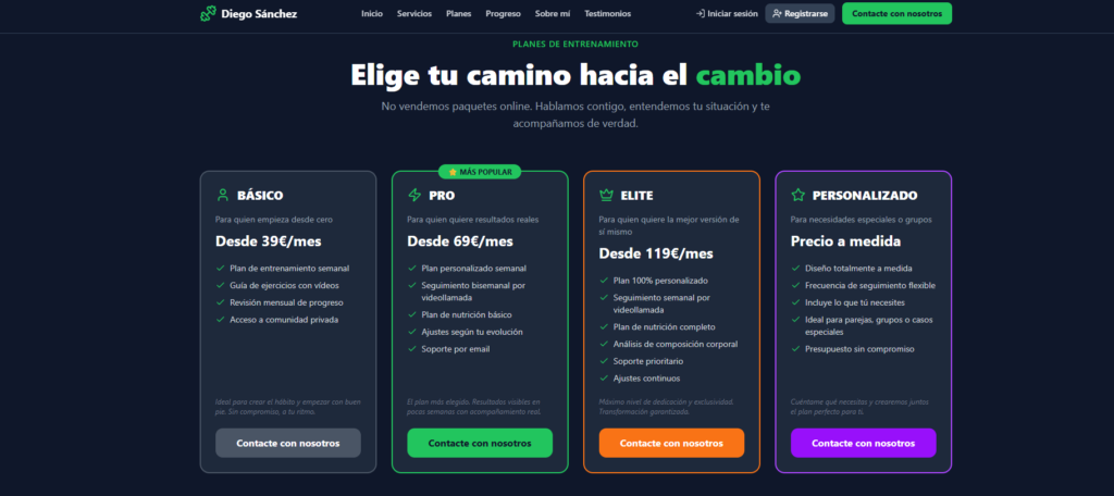 Web profesional con planes de precios y portfolio interactivo